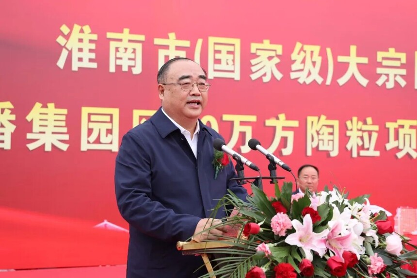 李懋书记在致辞中代表东辰集团向出席仪式的各位领导、来宾表示热烈的欢迎。他指出,近年来,东辰集团始终践行习近平生态文明思想,坚决落实党中央和省、市委关于推进绿色发展、创新发展、高质量发展的重大决策部署,按照“一个基地、两个园区”的建设总体思路和“国际先进、国内一流、绿色环保、持续发展”的发展目标,将发展煤电固废物综合利用产业作为企业的重大转型发展战略,致力于从根本上解决煤电固废物污染问题。40万方陶粒项目的正式投产运营,是东辰集团继潘集园区年产120万吨煤矸石陈化熟料仓储加工一体化项目、年产50万吨粉煤灰仓储加工一体化项目,凤台县丁集园区年产100万吨煤矸石陈化熟料仓储加工一体化项目、年产2亿块(折标)煤矸石保温砌块项目启动后,园区重点项目建设的又一重大成果。东辰集团将认真学习贯彻党的二十大精神,在市委市政府的正确领导下,加强与淮河能源、安徽理工大学、市直相关部门和县区之间协调配合,奋力推进淮南市(国家级)大宗煤电固废物综合利用基地建成国家级煤电固废综合利用产业积聚示范基地、安徽省绿色发展示范基地、国家级绿色建材生产基地的目标,为美丽淮南绿色发展做出积极的贡献。